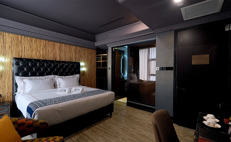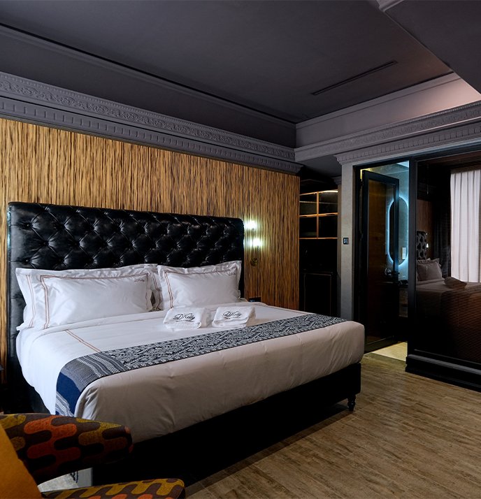 A spacious room with a king-sized bed, offering luxurious comfort and modern amenities.